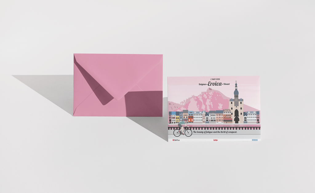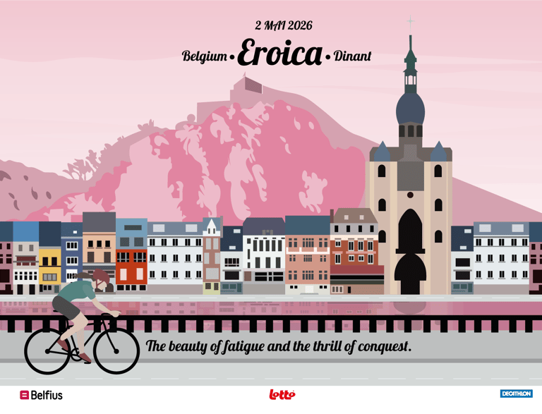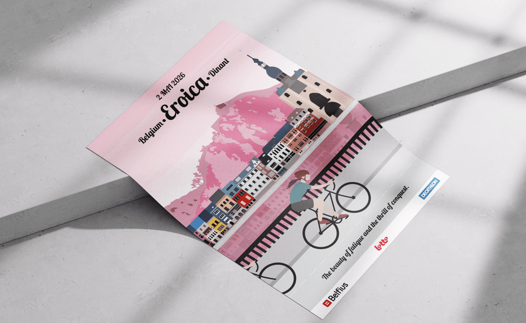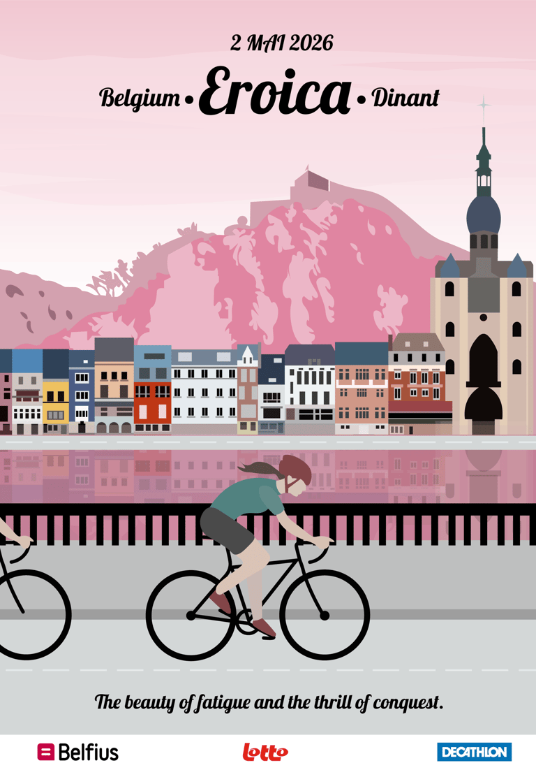 Direction artistique pour la première L'Eroica belge (2026). Conception d'une identité visuelle célébrant l'héritage du cyclisme vintage et l'authenticité territoriale, à travers un style graphique inspiré des illustrations rétro de Jolane. Déclinaison sur affiche et carte postale collector.