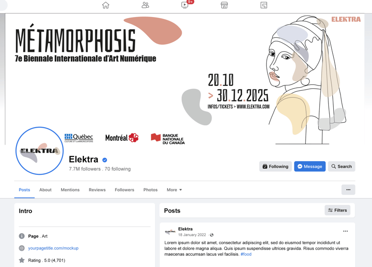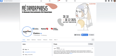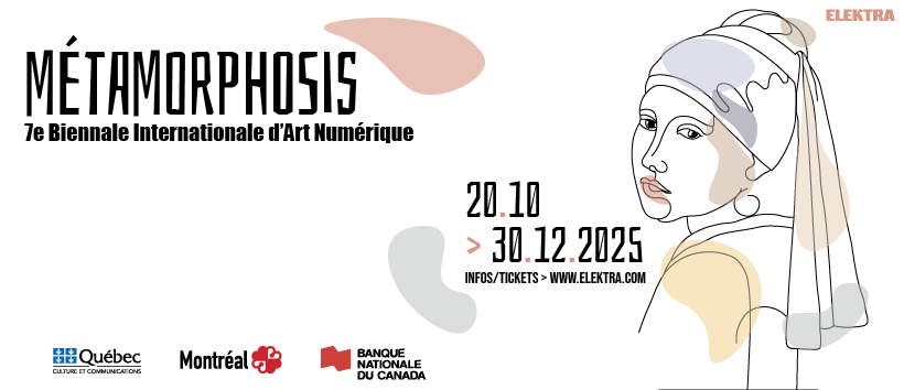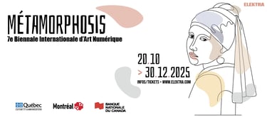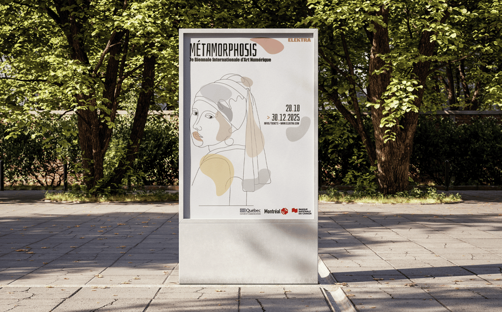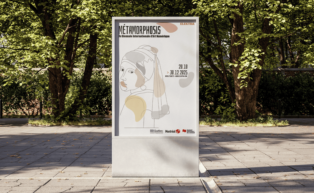 Design graphique complet pour la 7e Biennale Internationale d'Art Numérique du musée Elektra (Montréal). Création d'un système d'identité visuelle cohérent articulant illustration originale, communication urbaine (affiche grand format) et présence digitale (habillage Facebook). Le concept explore visuellement la thématique de la métamorphose à travers des éléments graphiques évolutifs et modulables.